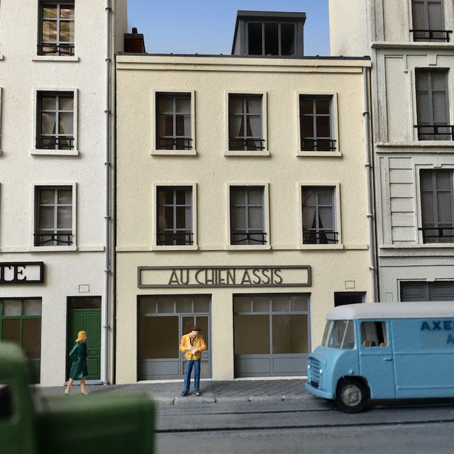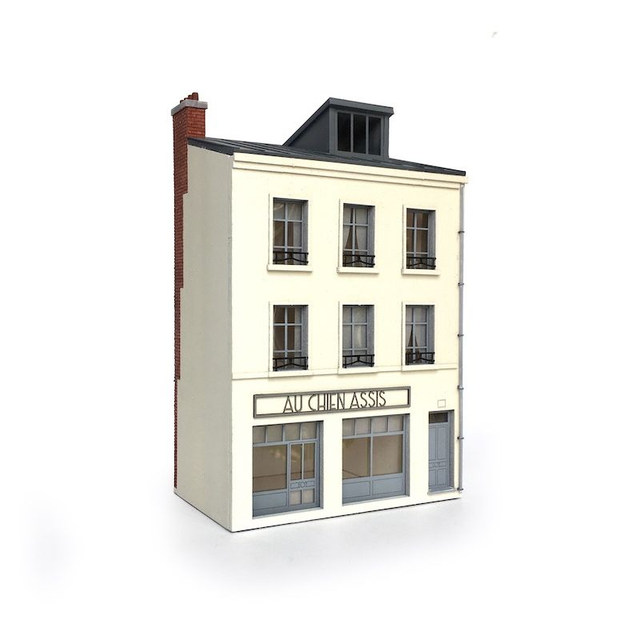 Ce type d’immeuble d’habitation simple et populaire avec commerce en rez-de-chaussée se retrouve en grand nombre à Paris et en Ile-de-France notamment. Il a deux étages, une modénature simple, une toiture en zinc à faible pente avec un forget (avancée de toit) très court et un chien assis. Il est compatible avec toutes les époques. Deux enseignes commerciales sont proposées : Au Chien Assis et L’Entre Potes. Modèle de fond de décor. Une structure avec planchers et cloisons est fournie.