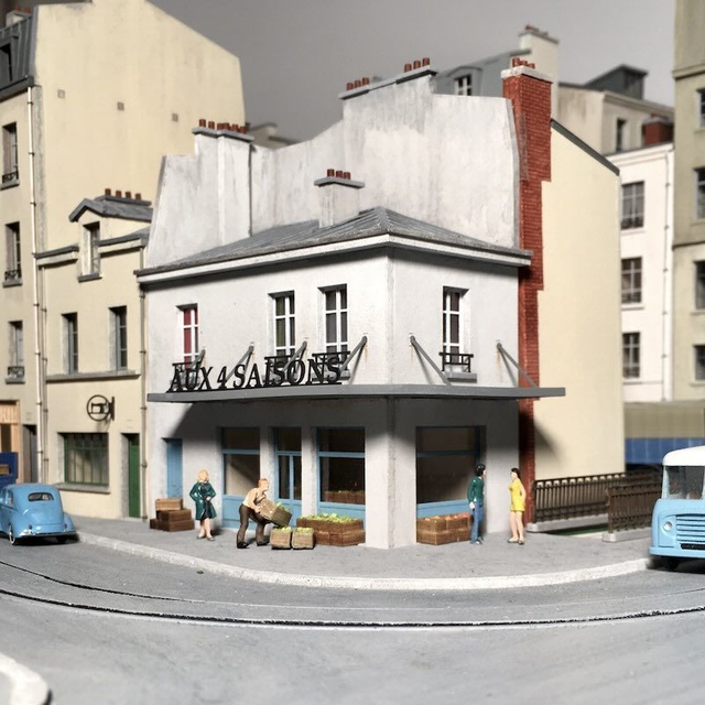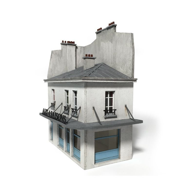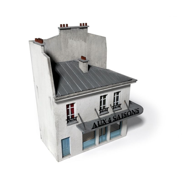 Cette construction d’angle s’inspire de bâtiments situés rue du Mail à la Croix-Rousse à Lyon qui ont la particularité d’avoir une profondeur étonnamment faible. Il en diffère par sa toiture en zinc. Il peut donc aussi bien servir de modèle complet que de modèle de fond de décor. Deux enseignes sont proposées: »Brasserie » et »Aux 4 saisons ». Le modèle est en carton découpé au laser. Une structure intérieure avec planchers et cloisons est fournie.