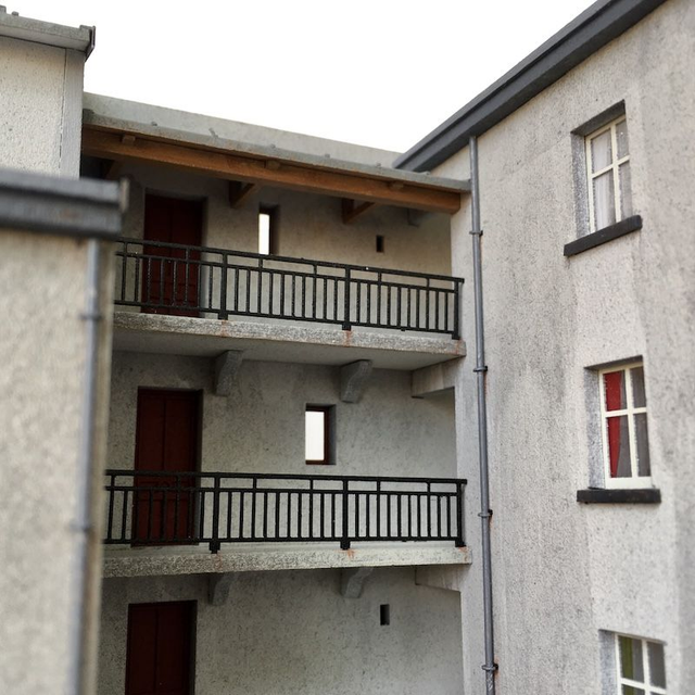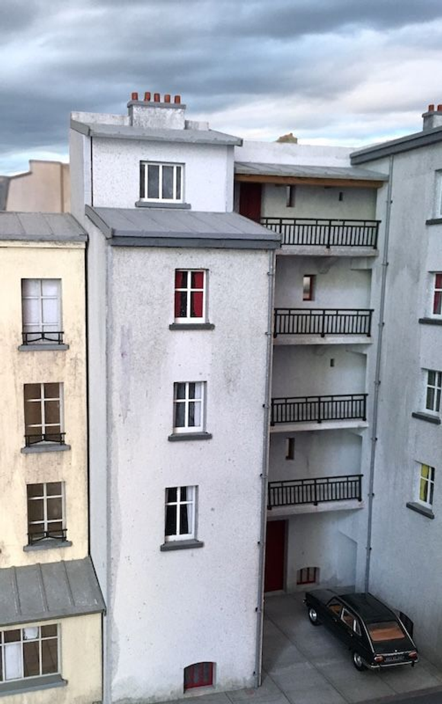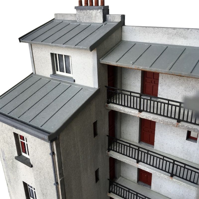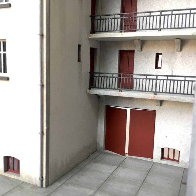 La façade arrière du bâtiment est caractérisée par des volumes complexes d’hauteurs variées et des coursives qui relient les ailes de cette construction. Elle s’inspire d’un immeuble lyonnais dont l’arrière est visible depuis la rue d’Anvers. Il comporte 4 étages et une toiture en zinc. Le modèle trouvera sa place à l’arrière d’une voie de chemin de fer, par exemple. C’est un modèle de fond de décor plutôt difficile à construire. Une structure intérieure avec planchers et cloisons est fournie. Le modèle est en carton découpé au laser.