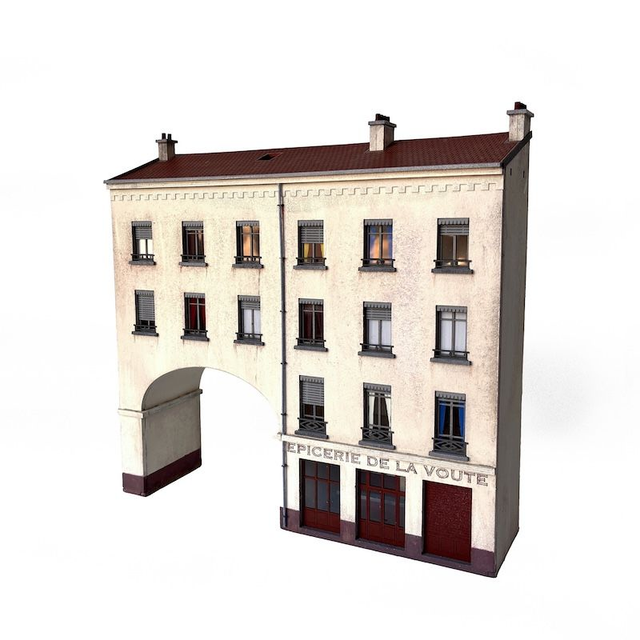 Ce bâtiment s’inspire d’un immeuble très particulier du quartier de la Guillotière à Lyon. Une voûte haute de deux niveaux ouvre le passage à la rue Saint-Michel. C’est un modèle de fond de décor à l’échelle Ho. Il sera également très utile comme accès à une coulisse pour un tramway, un Faller Car System ou simplement fermer une perspective. La hauteur maximum sous la voûte est de 66mm. Une structure intérieure avec planchers et cloisons est fournie ainsi qu’un aménagement succinct de la boutique en rez-de-chaussée. Il est comme on peut le voir sur des cartes postales anciennes à l’enseigne d’une épicerie.