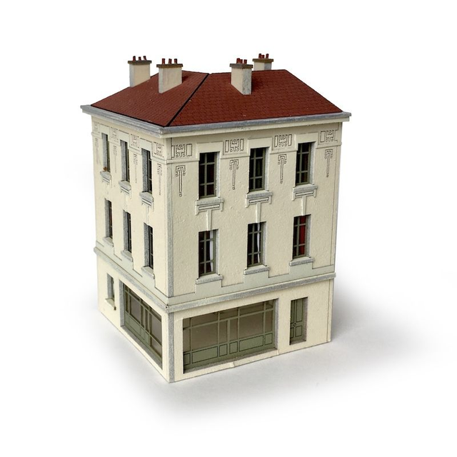 Cet immeuble d’angle de deux étages s’inspire d’un bâtiment situé sur la route de Vienne (autrefois RN7) à la sortie sud de Lyon. Cet immeuble se distingue par sa décoration soignée. Le modèle trouvera sa place dans tous les décors de ville, de banlieue et même de petite ville. Il est proposé avec l’enseigne l’Escale Bar-Tabac.