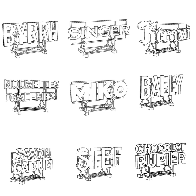 Diverses enseignes sont proposées : Bally, Byrrh, Chocolat Pupier, Kiravi, Magasins Généraux, MIKO, Nouvelles Galeries, STEF, Savon Cadum, Singer. Maquette en kit à peindre et à monter à l’échelle Ho – 1/87. Modèle en carton découpé au laser fabriqué en France. Modèle pour collectionneurs et modélistes adultes. Ne convient à un enfant de moins de 14 ans.