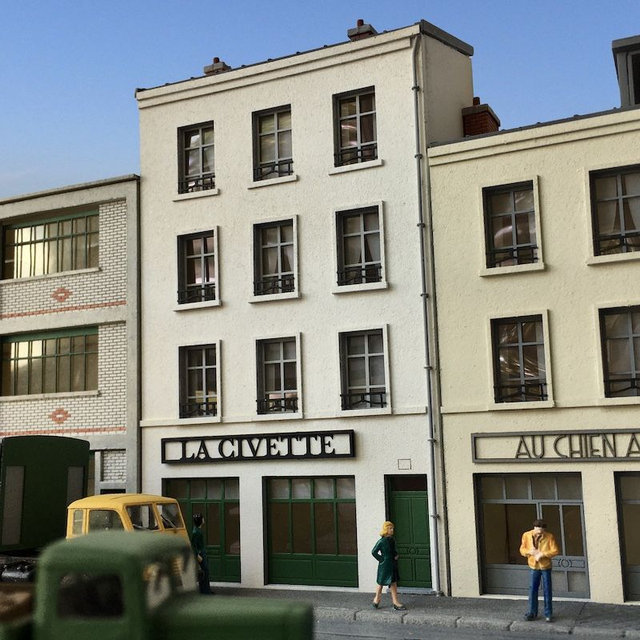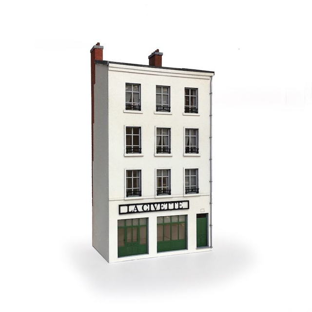 Ce type d’immeuble d’habitation simple et populaire avec commerce en rez-de-chaussée se retrouve en grand nombre à Paris et en Ile-de-France notamment. Il a trois étages, une modénature simple et une toiture en zinc à faible pente avec un forget (avancée de toit) très court. Il est compatible avec toutes les époques. Deux enseignes commerciales sont proposées : La Civette et Cordonnerie. Modèle de fond de décor. Une structure avec planchers et cloisons est fournie.