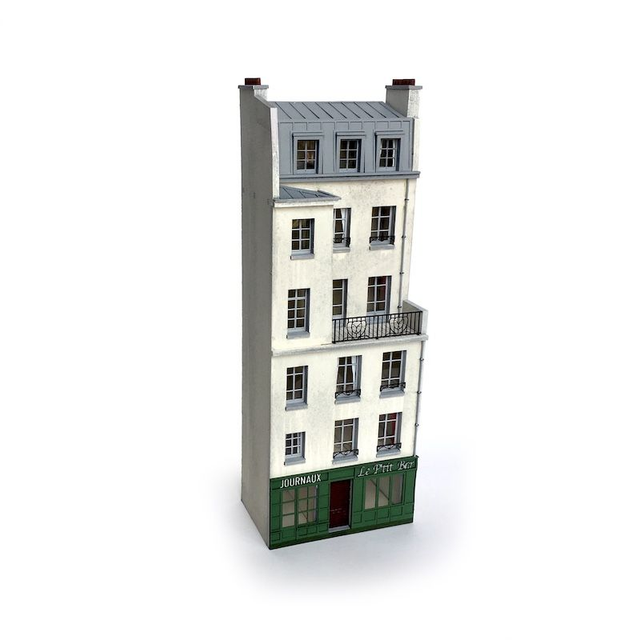 Il n’y a pas qu’Haussmann à Paris ! Cet immeuble en est un contrepied parfait. Ses volumes inhabituels, ses fenêtres de différentes tailles, ses combles mansardés et sa ferronnerie soignée laissent à penser qu’il a été construit par agrandissements successifs sur différentes périodes. Ce type d’immeuble d’habitation simple et populaire avec commerce en rez-de-chaussée est un bon exemple de l’architecture pré-Haussmannienne. Il est compatible avec toutes les époques. Modèle de fond de décor. Une structure avec planchers et cloisons est fournie.