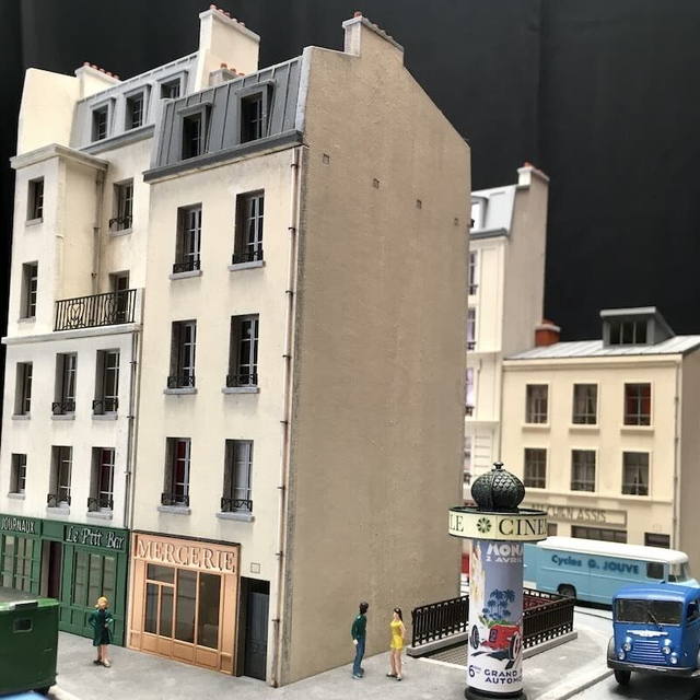 Ce petit immeuble s’inspire d’un immeuble d’habitation situé rue de Charonne à Paris. C’est un bâtiment simple, populaire et sans fioritures avec commerce en rez-de-chaussée. On retrouve de type de construction en grand nombre à Paris et en Ile-de-France notamment. Il a trois étages, une modénature simple, une toiture en zinc qui recouvre ses combles mansardés. Il est compatible avec toutes les époques. Ce modèle est une version complète. Au rez-de-chaussée, le commerce est à l’enseigne d’une mercerie. Une structure intérieure avec planchers et cloisons est fournie.